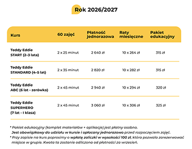 Oferujemy kursy już od 2. roku życia. Program Teddy Eddie START jest dostosowany do możliwości